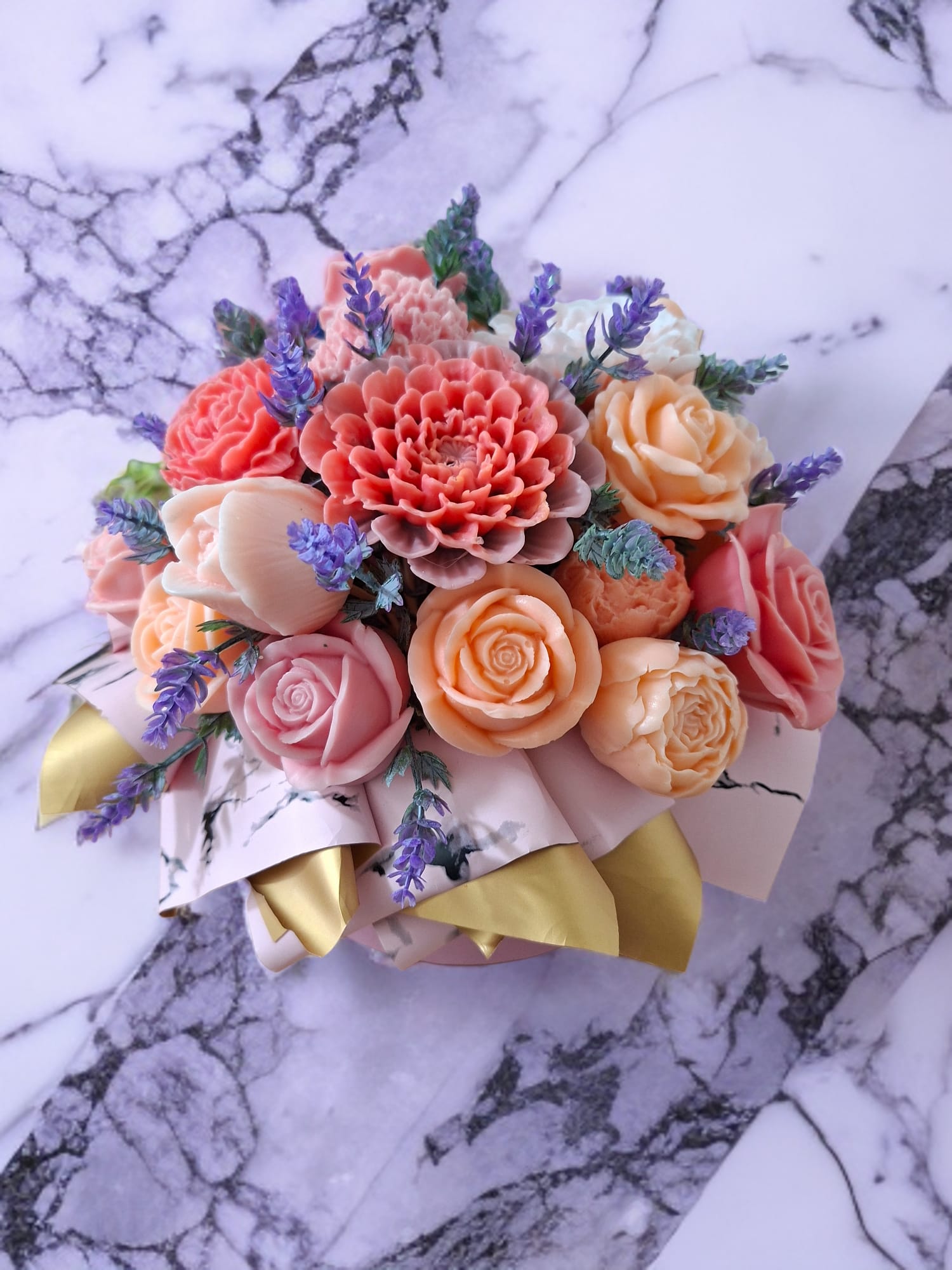 Aranjament floral handmade realizat din flori delicate din săpun, în nuanțe elegante de roz, piersică și crem, completat cu accente fine de lavandă. Un cadou rafinat, parfumat discret, perfect pentru orice ocazie specială și ideal ca decor de durată.